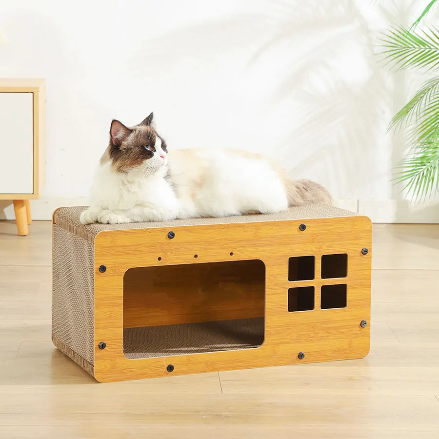 Ten produkt to wielofunkcyjny domek i drapak dla kota, który pełni rolę legowiska, kryjówki i powierzchni do drapania.